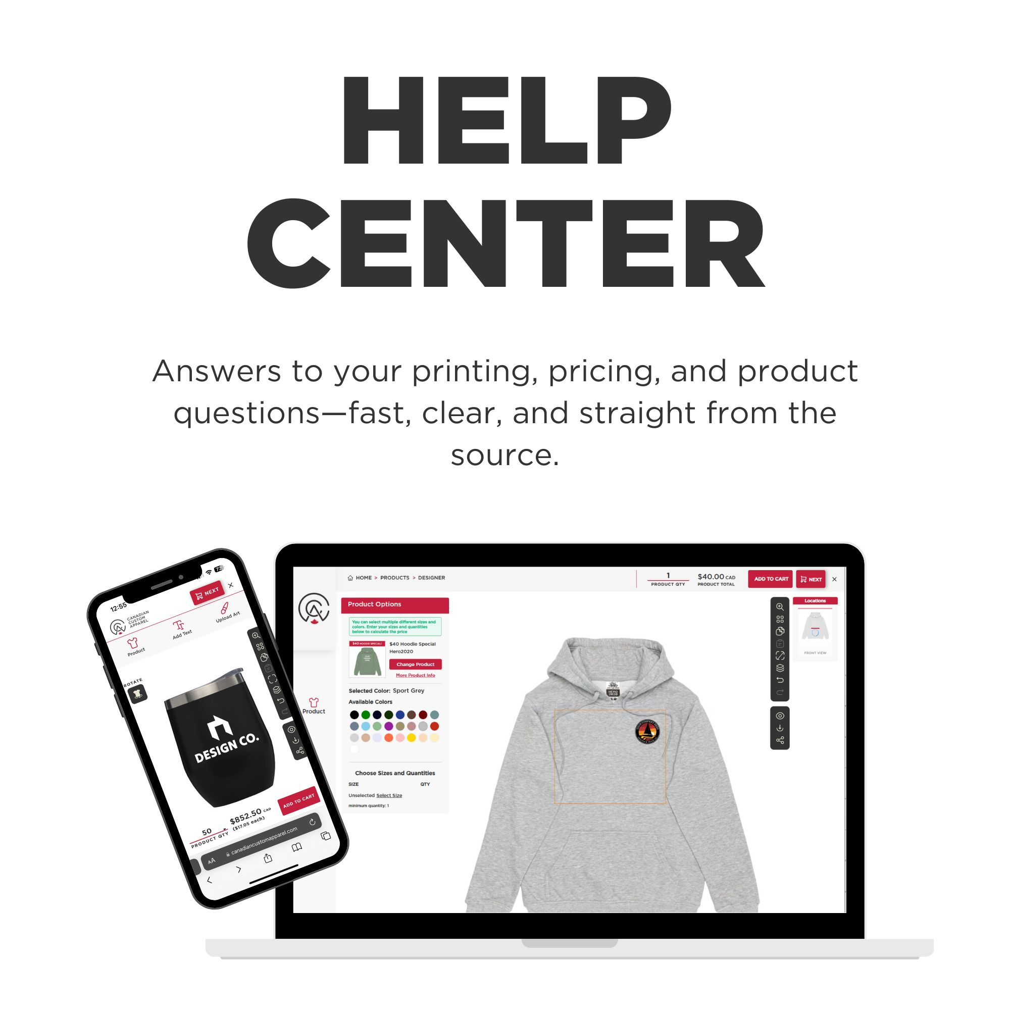 You can either place your full order online through our Design Lab or email us your artwork and details such as quantity, product type, print specs and your logos/designs.