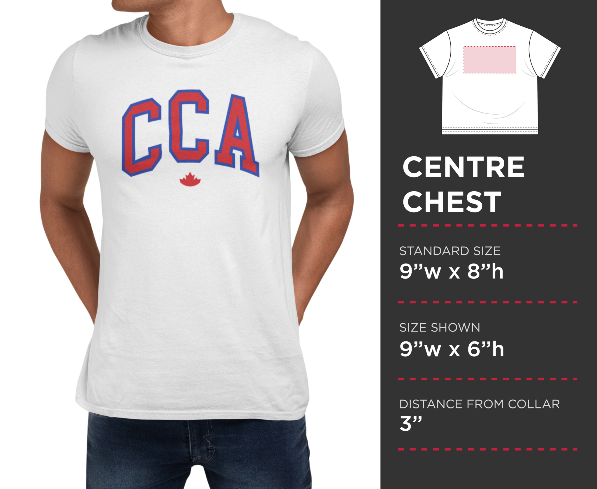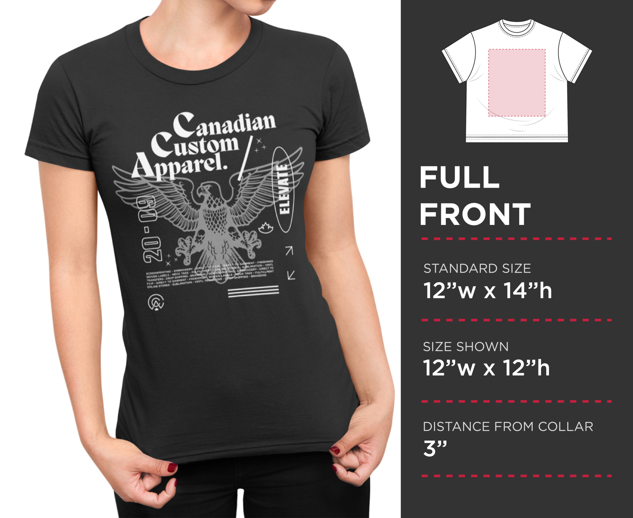 If you were planning for a standard front print, you have a choice between this location and a Full Front (see below). The range of garment sizes in your order could help decide; if they skew smaller, especially into youth sizes, go with Center Chest. If they skew larger, into the 3XL range, you may want to go with a Full Front.