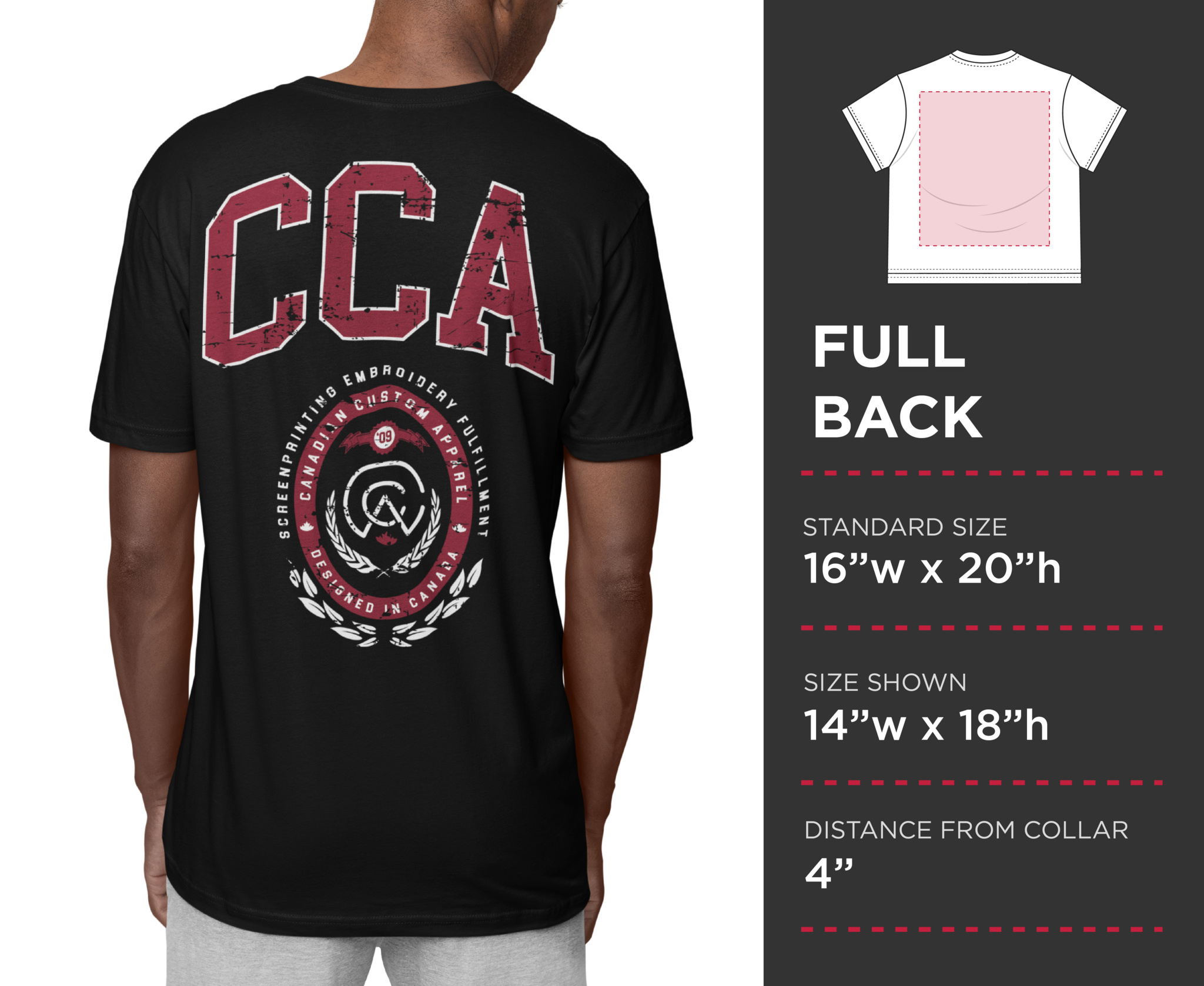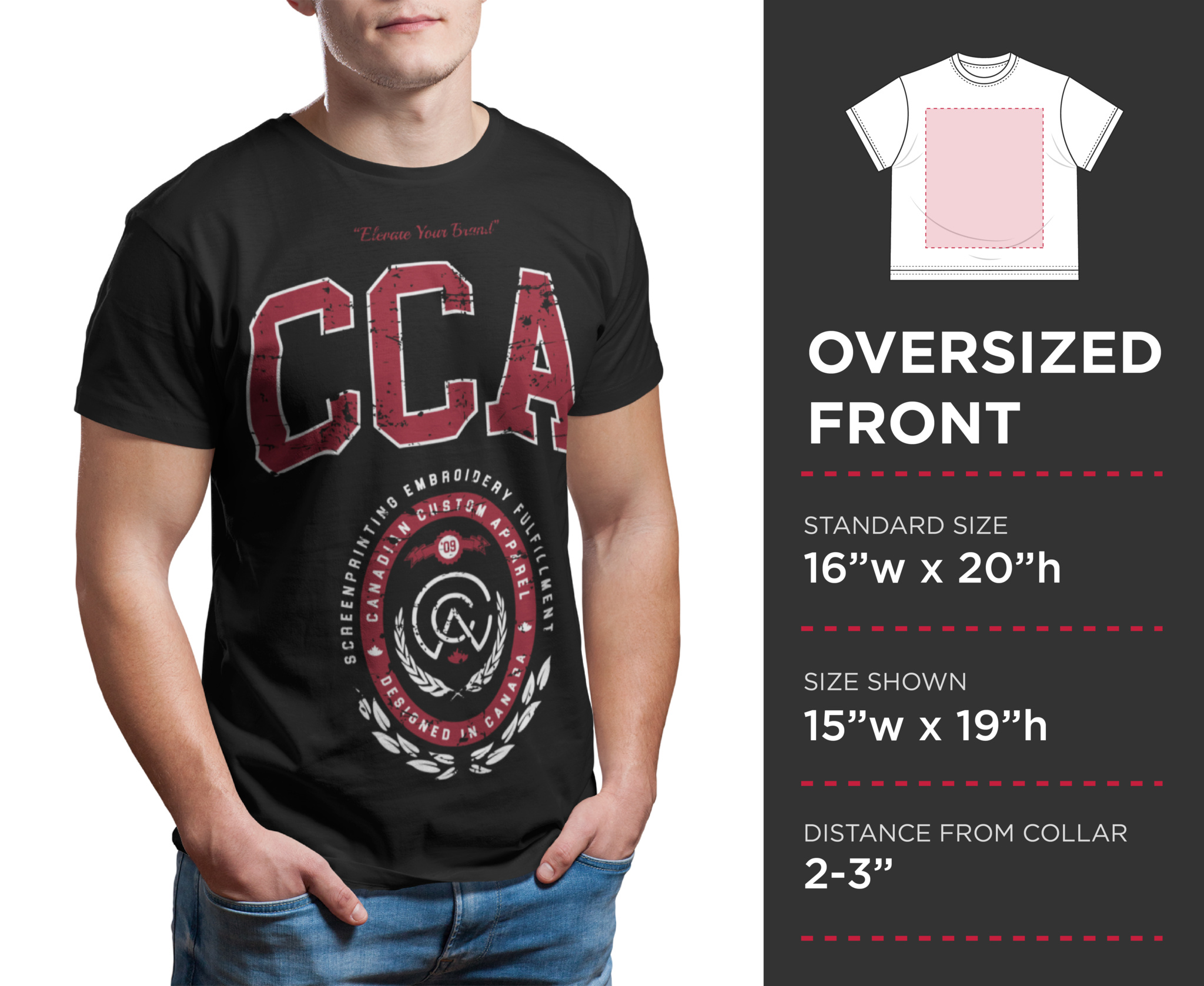 An oversize print refers to any design that exceeds the dimensions of a standard full-front print. Our maximum print size is 16 inches wide by 20 inches high. The placement for these prints usually begins higher than a standard front print, approximately 2 to 3 inches down from the collar.