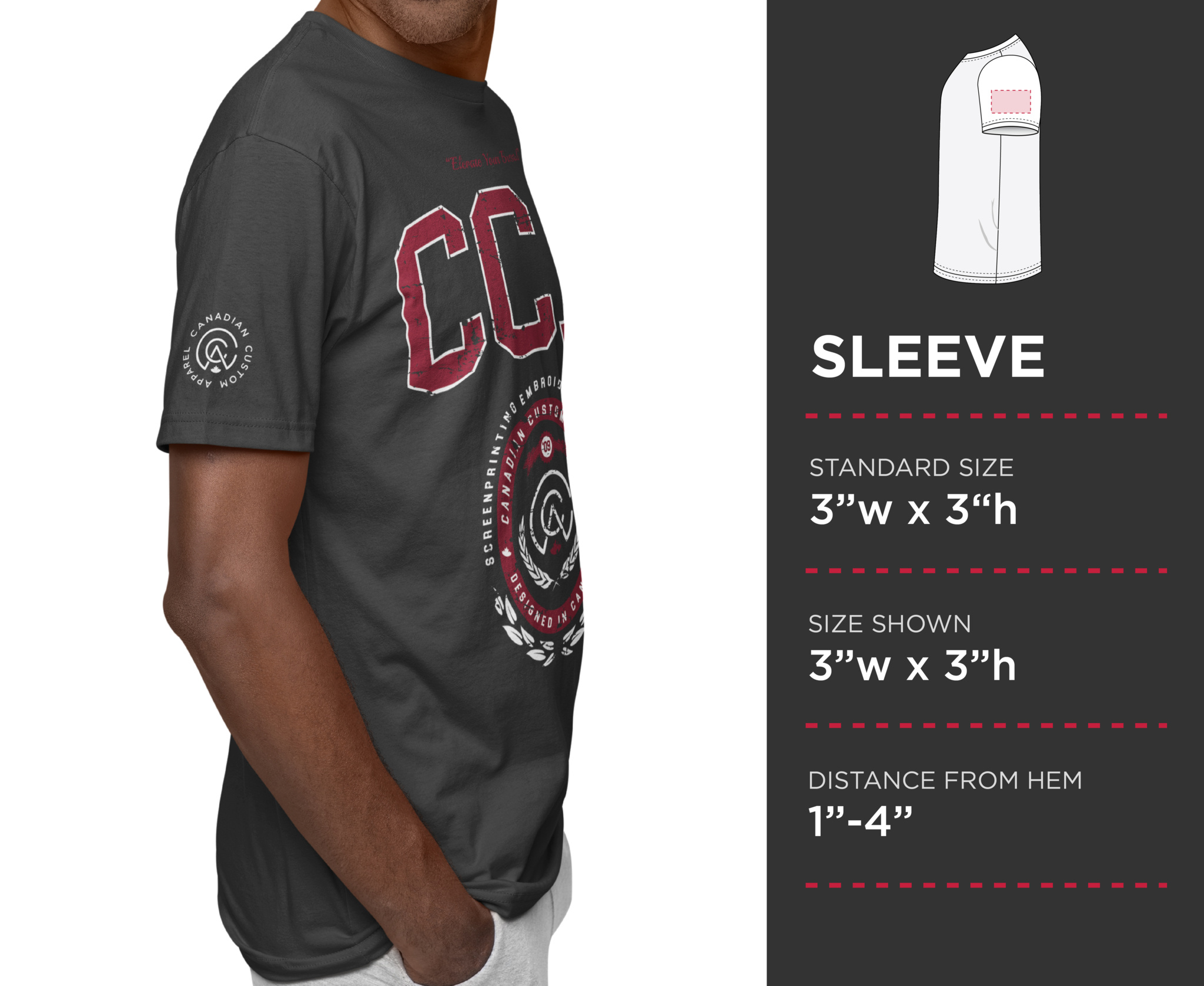 The sleeve typically looks best with a smaller print size. The standard width is around 3 inches, but we can go up to 4.5 inches wide (though this is only recommended for very wide logos) or as small as 1 inch wide.